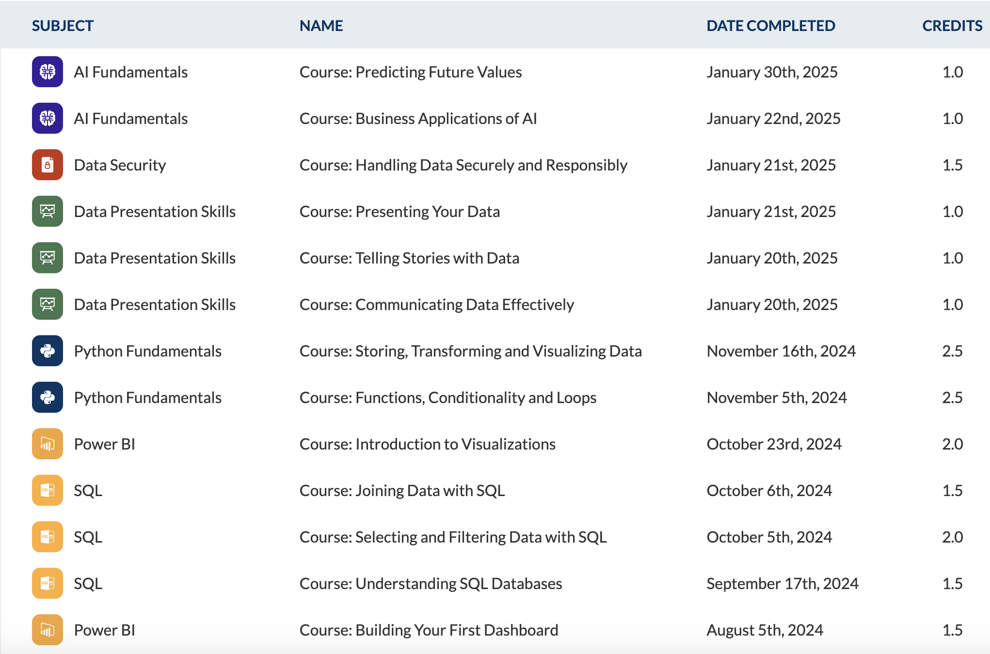 Over the past few years, I’ve actively engaged with a wide range of additional courses to build practical, industry-relevant skills in data analytics, AI, visualisation, and business software. These certifications represent more than just technical knowledge, they reflect my ongoing commitment to continuous learning and applying data-driven insights in real-world scenarios. From early foundations in Excel and Tableau to more advanced concepts in Python, SQL, and AI, each course has contributed to deepening my analytical thinking and problem-solving approach. Collectively, these certifications have given me a strong, well-rounded skill set that I’ve applied across academic projects, business cases, and technical implementations.